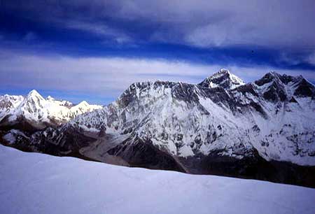アマダブラム頂上から、エベレスト、ローツェ、プモリを望ます。